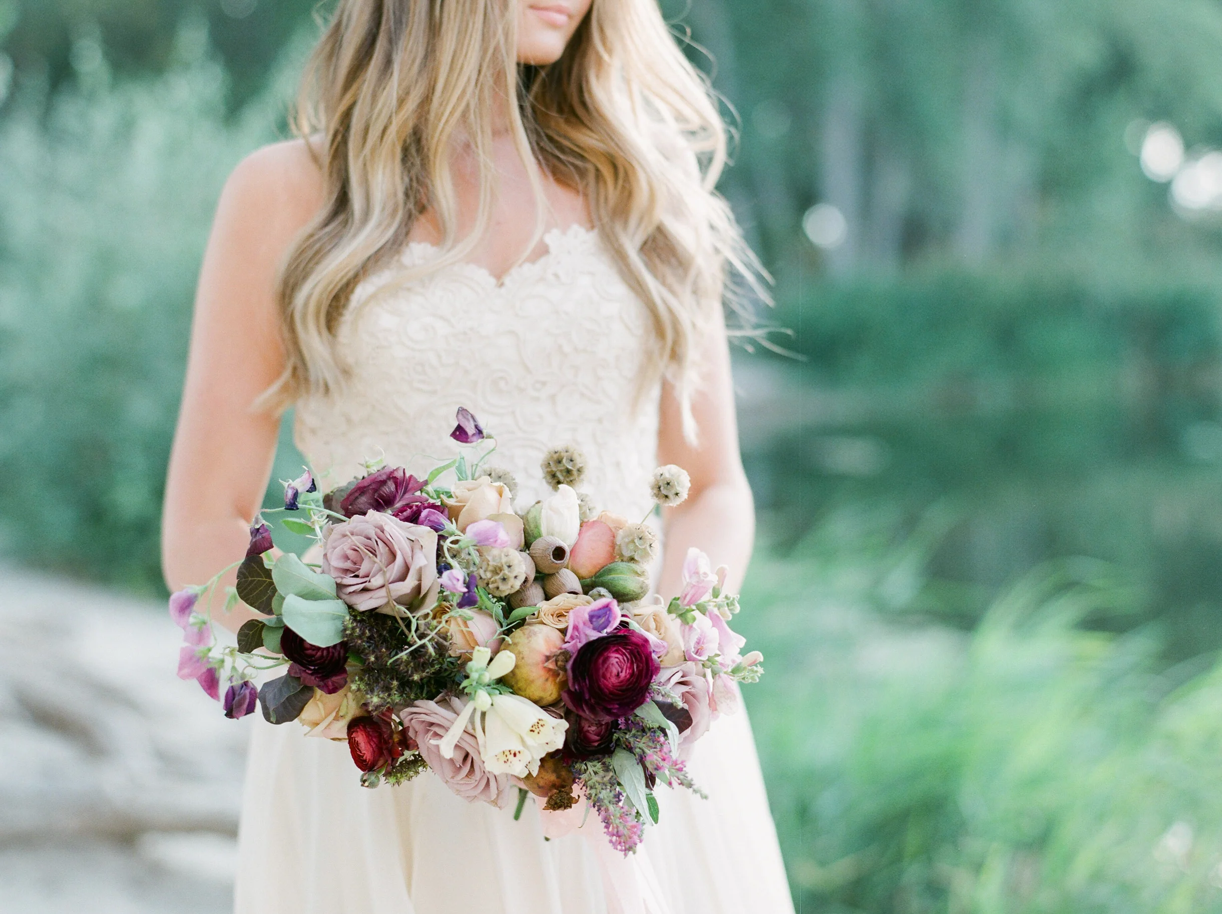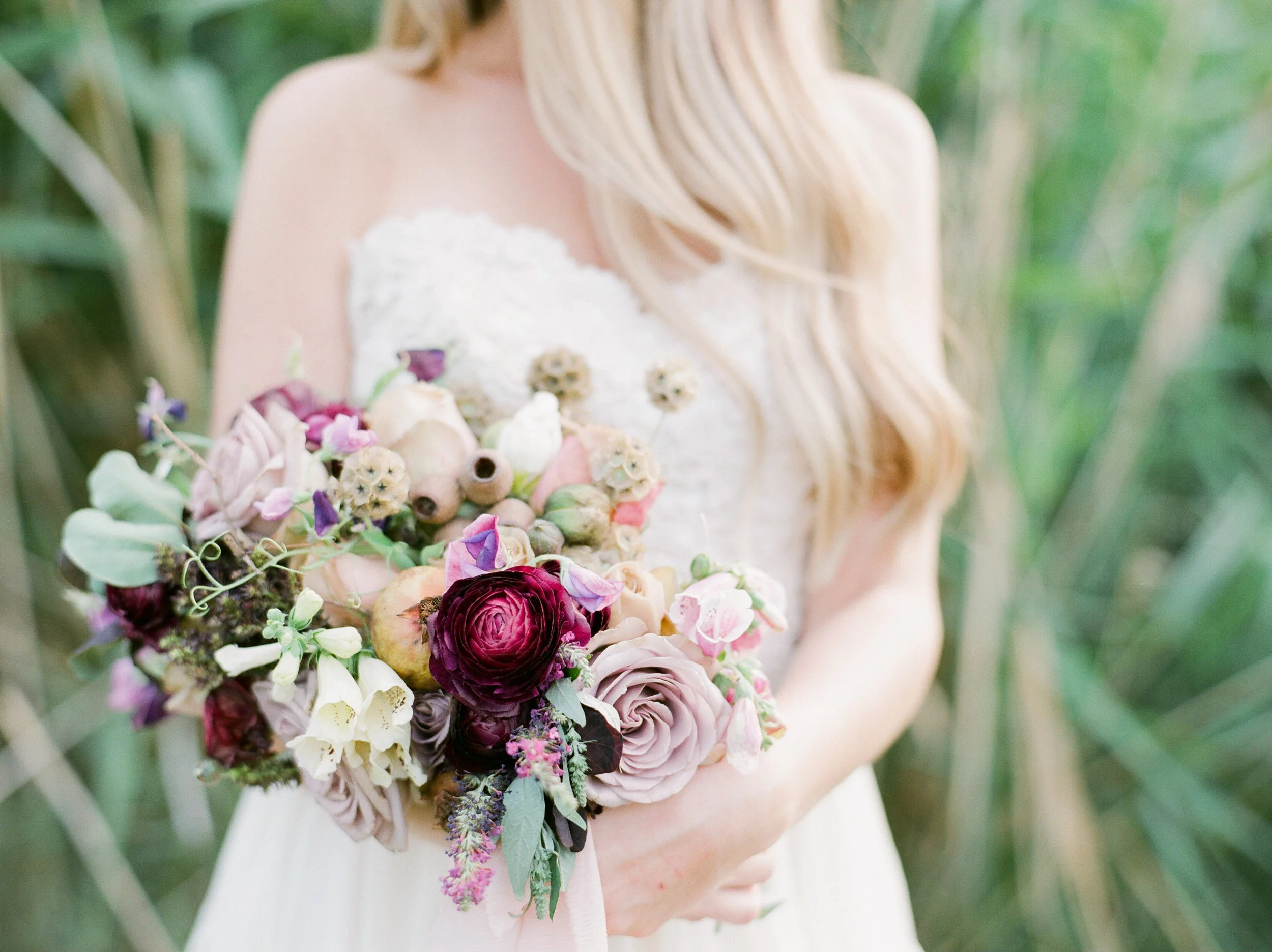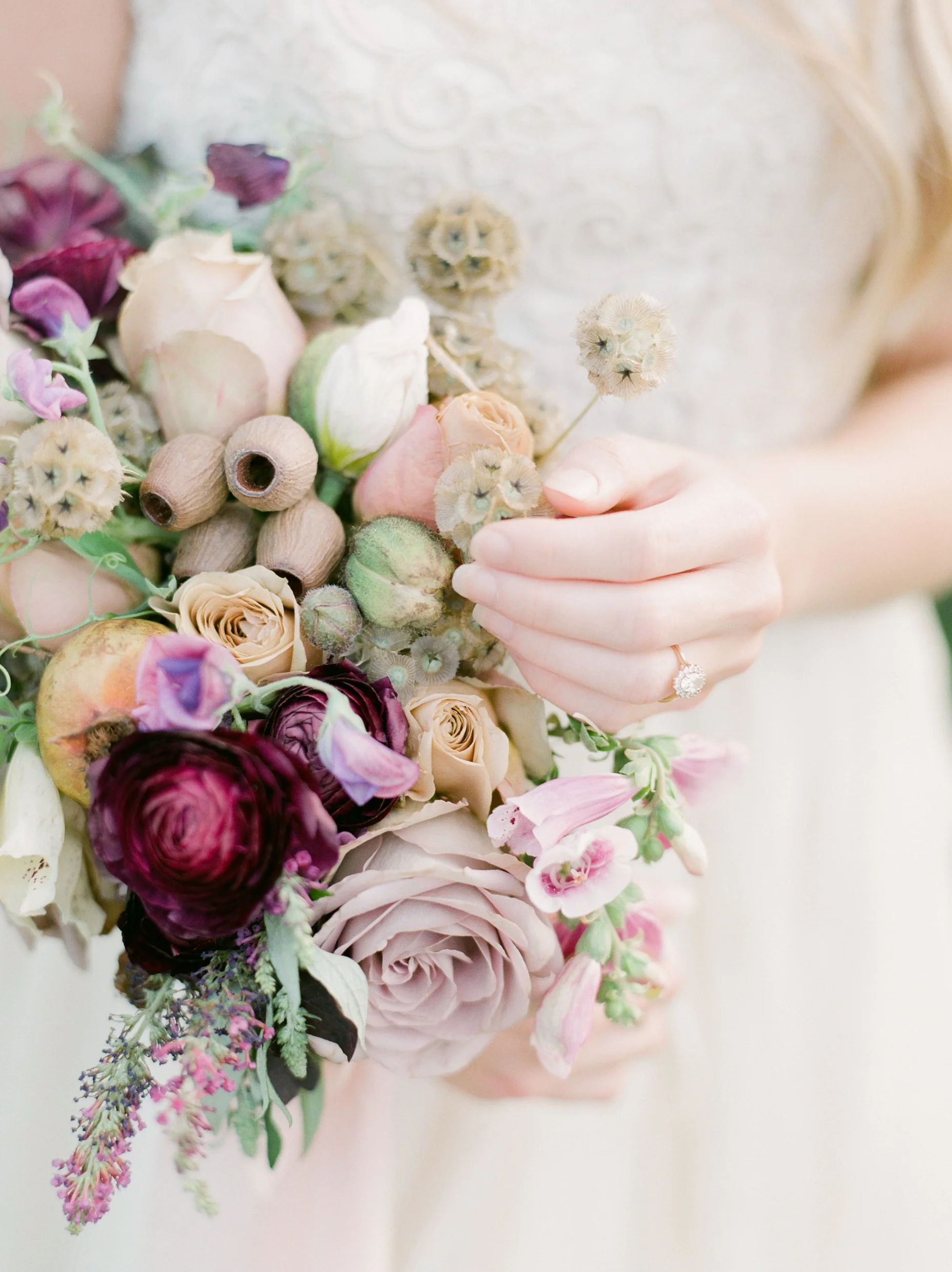 Pomegranates, eucalyptus pods, scabiosa pods, sweet pea. Oh, and those adorable poppies! They're all leftovers from a week's worth of work and make for a wonderful leftover bouquet!
