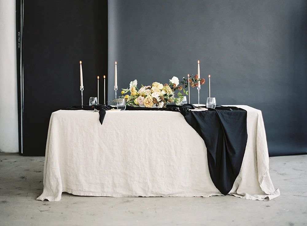 Tablecloth, Napkins and Silver Candlesticks Williams Sonoma