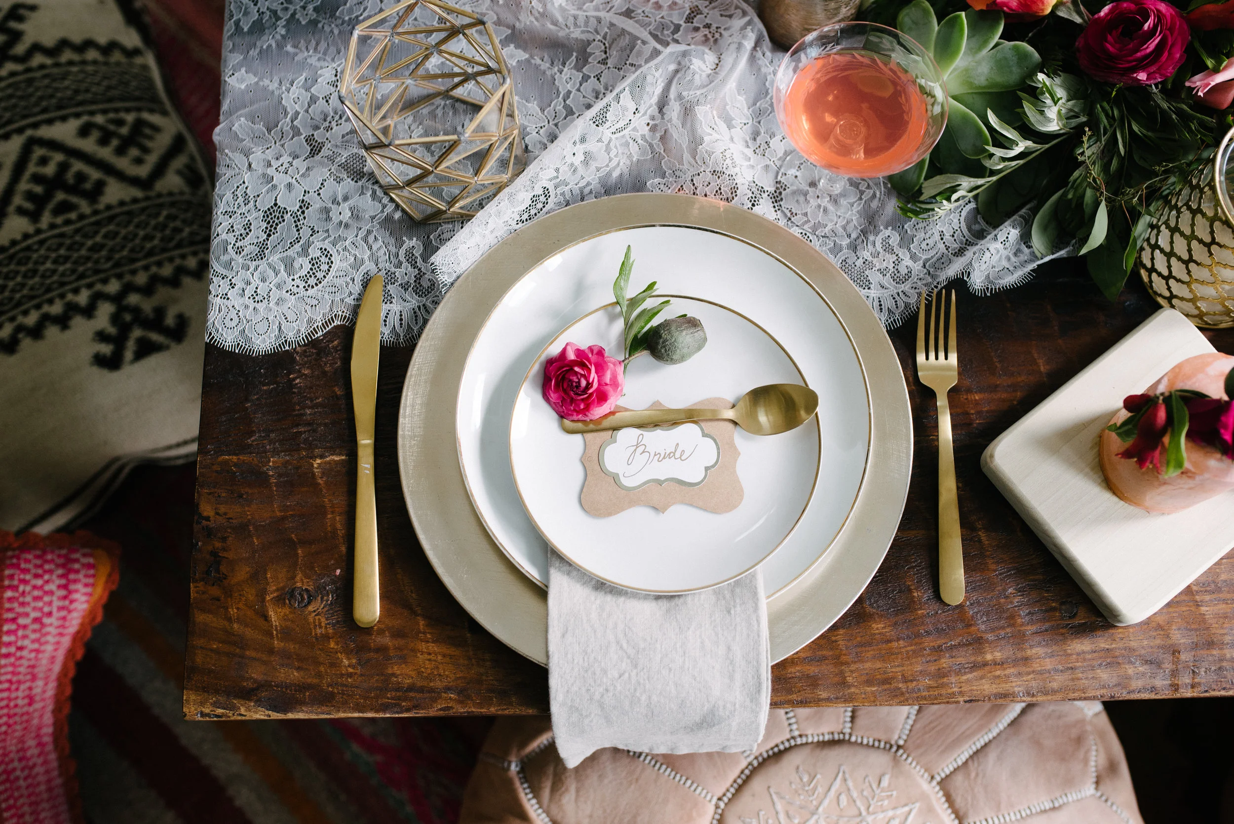 Wool rugs, leather ottomans and sheepskin throws pack a luxurious punch to the scene. Add a lush garland filled with florals, succulents and greens for extra romance.