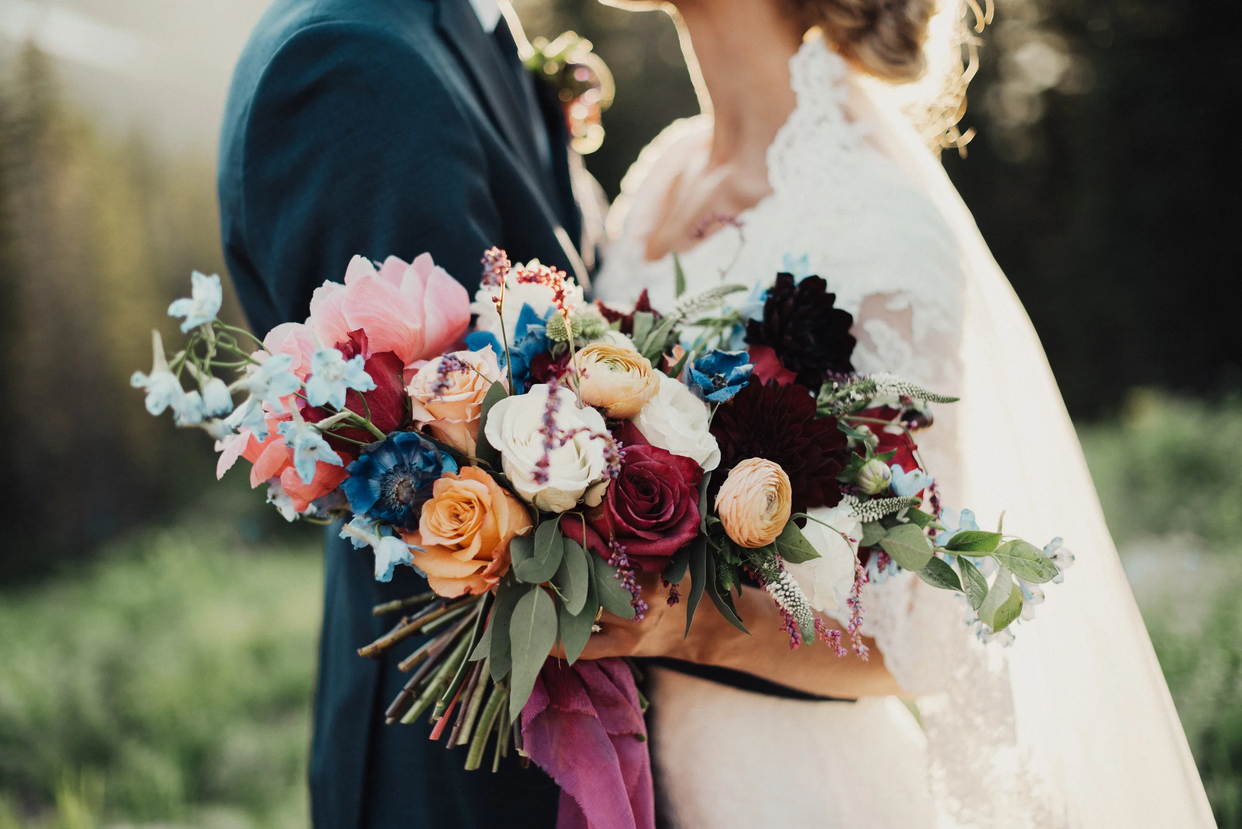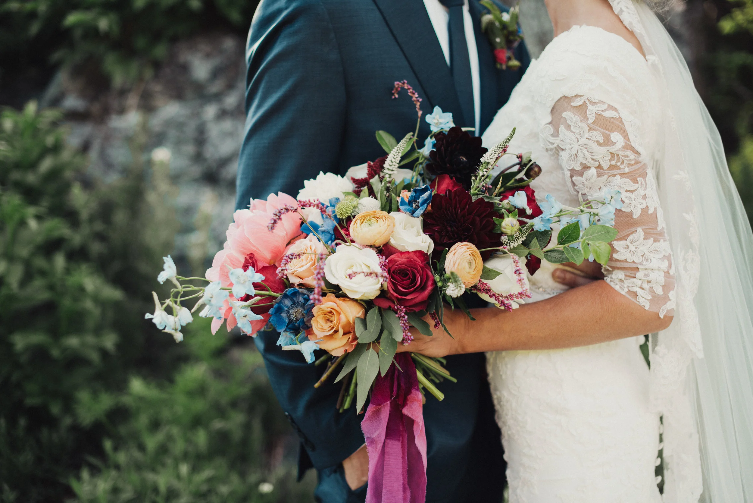 We decided to put most of our emphasis, all of the color, and the tiniest glimpses of boho, into her bouquet. This girl needed to call all of the attention. And we both got giddy when we decided on a plum/magenta ribbon! Yes!!! That was the starting point that got the juices flowing. The rest just came together!
