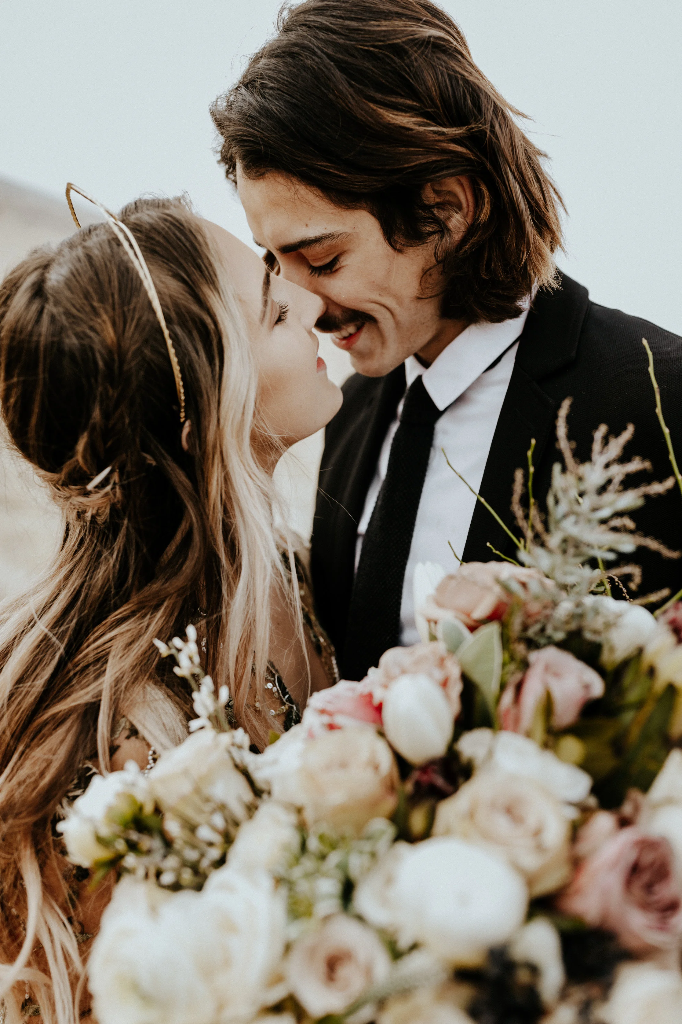 What do you think of that crown? Talk about a modern day queen? That crown is it! Soft, natural hair in a half up do accents it perfectly. Flawless natural makeup that defines the natural beauty in this bride. Florals that also make a statement and pull out the tones and detail in that gown. Ribbon. I don't ever think I even need to say anything about ribbon. The setting. Weeds. Rocks. Dirt. A bit of water in the background. A golden sunset. Editing style that knocks these images out of the park.